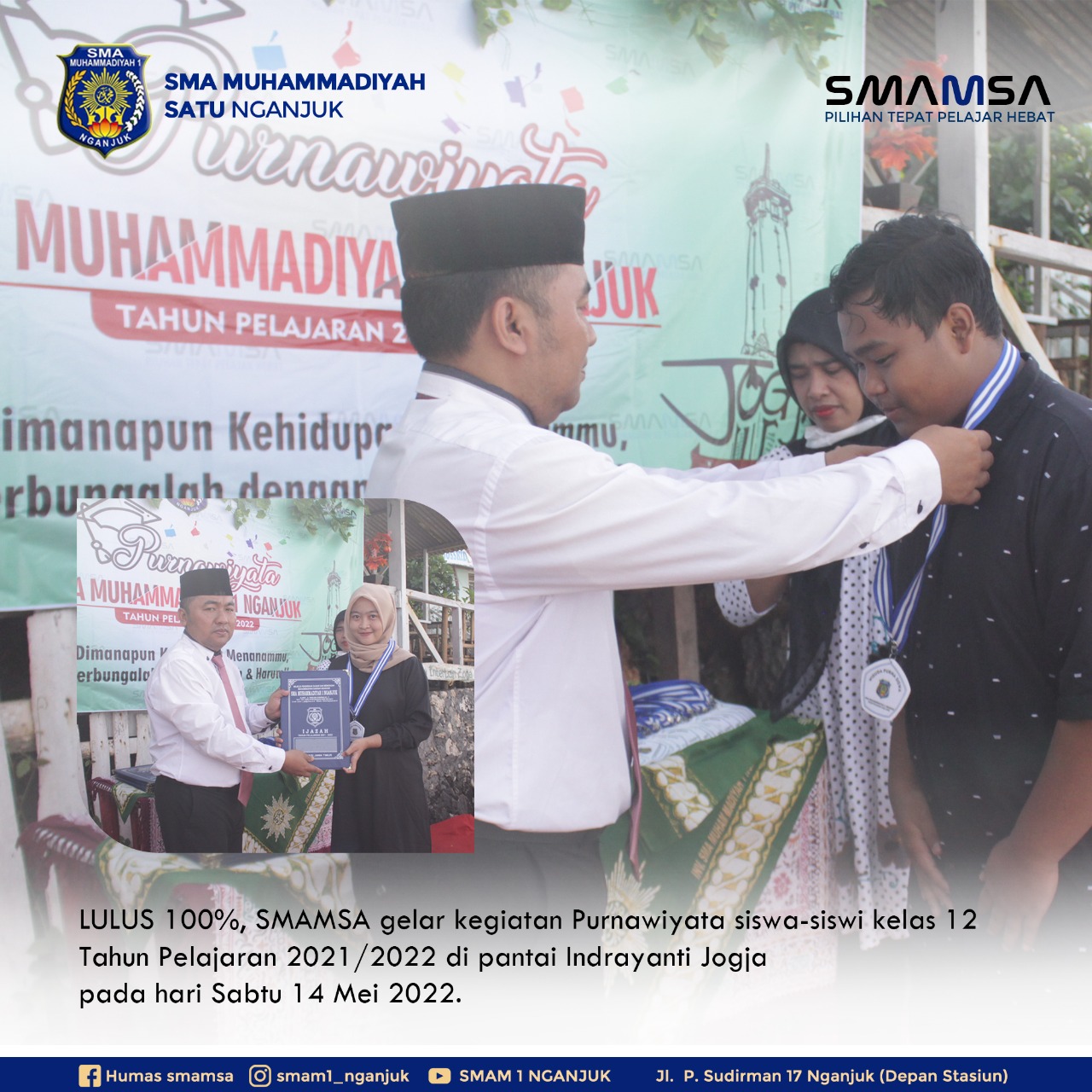 SMA Muhammadiyah 1 Nganjuk yang telah menyelesaikan pendidikannya selama 3 tahun, program IPA dan IPS yg berjumlah 76 siswa dinyatakan LULUS 100%. Pasalnya hari ini Sabtu 14 Mei 2022 merupakan hari dilaksanakan wisuda purnawiyata tahun 2021/2022″.